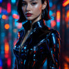 Neon Edge depicts a confident woman in a shiny black latex suit, standing against a nighttime backdrop flooded with neon lights. The color reflections on the suit mirror the colorful, cool light of the surroundings—a visual interplay of technology, fashion, and urban energy. With an expressive gaze and futuristic style, this work feels like a moment from a sci-fi film. The scene is simultaneously aesthetic, provocative, and powerful.