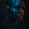 Neon Sentience depicts a striking portrait of a futuristic female cyborg figure, her face crisscrossed by vibrant blue and orange lines. Her expression is calm yet powerful, while the delicate digital patterns on her skin and technology symbolize the fusion of man and machine. The dark, textured background composition makes the neon-like contrasts particularly striking, lending the image a mystical, digital atmosphere.