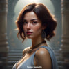 The setting—a place of stone and shadow, permeated by a hint of history—feels like the stage for an epic drama. Her appearance is both graceful and powerful, like a heroine who has just stepped into this one from another world. Every detail—from the elegant earrings to the simple, flowing clothing—underscores the contrast between stylized art and human reality.