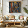 Ritual of Shapes is a profound, multi-layered A work of art that condenses diverse forms and figures into an intense, almost ritualistic pictorial space. The interlaced surfaces in blue, orange, ochre, and black create a visual field of tension in which humanoid beings, masks, symbols, and signs encounter each other.