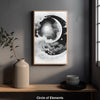 エレメントの輪 光と闇、水と空、静寂とエネルギーの永遠の調和を表現した、視覚的に素晴らしい芸術作品です。力強い円形のデザインの中で、月、雲、波、そして宇宙の構造が象徴的な一体へと溶け合っています。これは、 陰と陽。
