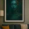 穏やかな女性の姿が、幾何学的なデータの粒子へと溶け込んでいくかのようだ。閉じられた瞳は、深み、静寂、そして人間と機械の繋がりを表現している。この作品は、意識とテクノロジーの融合を象徴し、美的、未来的、そして瞑想的な様相を呈している。