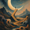 Ein Mann steht auf einer Treppe, die sich ins Nichts windet – hinauf zum leuchtenden Halbmond. Die Landschaft unter ihm ist fremd, weich geformt, durchzogen von fließenden Linien und dunklen Öffnungen. Berge säumen den Horizont, doch der Blick richtet sich nach oben: über das Sichtbare hinaus, über das Bekannte.