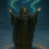 Aurora Ritual zeigt eine weise Frau in dunkler Robe, die unter tanzenden Polarlichtern ein magisches Ritual vollführt. Leuchtende Runen kreisen sie, während Schnee fällt und die Nacht in mystisches Licht taucht. Das Bild strahlt Kraft, Weisheit und eine tief verbundene Spiritualität aus – wie ein uraltes nordisches Märchen in Pixeln erzählt.