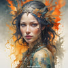 Dieses fantasievolle Porträt zeigt eine junge Frau mit intensiven Augen, umgeben von leuchtenden Farben und herbstlichen Elementen. Ihr Haar ist mit einem kunstvollen Kranz aus Blättern und Federn geschmückt, ihre Kleidung scheint aus der Natur selbst zu bestehen – ineinander fließende Farben von Orange, Ocker, Blau und Erde. Der Hintergrund wirkt wie gemalt, mit dynamischen Farbexplosionen. Dieses KI-generierte Kunstwerk verbindet natürliche Schönheit mit künstlerischem Ausdruck – ideal für Liebhaber symbolischer, saisonaler und poetischer Ästhetik.