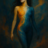 „Balance of Fire and Flow“ zeigt eine weibliche Figur, deren Körper in lebendig gemalten Farben erscheint – eine Hälfte in warmem, leuchtendem Orange, die andere in kühlem Blau. Die Silhouette verschmilzt mit dem Hintergrund wie ein lebendiges Gemälde aus Feuer und Wasser. Ihre geschlossenen Augen verleihen dem Bild Ruhe und inneres Gleichgewicht. Dieses Werk vereint Gegensätze in Harmonie – ein Symbol für Ausgeglichenheit, innere Kraft und die Einheit von Emotion und Verstand.