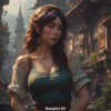 Die Szene wirkt wie ein Ausschnitt aus einer längst vergessenen Welt – geheimnisvoll und lebendig zugleich. Der Hintergrund, mit seinen verwinkelten Gassen und fernstehenden Türmen, erzählt Geschichten vergangener Zeiten. Und mittendrin: eine Gestalt, die wirkt, als sei sie Teil dieser Legende. Ihre Ausstrahlung vereint Stärke und Anmut, Natürlichkeit und Magie.