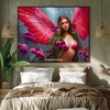Beautiful Nature zeigt eine traumhafte Fantasy-Waldfee mit leuchtend roten Flügeln, umgeben von pinken Blüten. Ein KI-generiertes Meisterwerk, das Magie und Natur vereint.