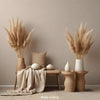 Dieses KI-generierte Kunstwerk präsentiert eine harmonische Boho-Wohnszene mit getrocknetem Pampasgras in stilvollen Vasen, einer Holzbank mit weichen Textilien und Keramikdekorationen. Die warmen Beigetöne und natürlichen Materialien verleihen dem Raum eine ruhige, einladende Atmosphäre. Ideal für moderne Innenraumgestaltungen, die Natürlichkeit und Minimalismus vereinen.