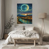 Celestial Evening entführt den Betrachter in eine verträumte Nachtkulisse voller Magie und Ruhe. Über den leuchtenden Dächern einer malerischen Stadt, deren Uferpromenade vom Schein der Straßenlaternen erhellt wird, thront ein gewaltiger, mystisch schimmernder Mond. Die Szene vereint himmlisches Lichtspiel mit architektonischer Romantik, während der ruhige Fluss das Himmelsleuchten widerspiegelt – ein perfektes Zusammenspiel aus Natur, Fantasie und urbaner Stille.
