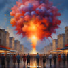 Collective Awe zeigt eine Menschenmenge inmitten einer historischen Stadtstraße, die gebannt auf eine gewaltige Explosion aus Farben und Licht am Himmel blickt. Das Szenario erinnert an ein kollektives Staunen, fast wie bei einem Feuerwerk oder einem magischen Ereignis – zwischen Euphorie, Ehrfurcht und Staunen. Die leuchtenden Farben in Orange, Rot, Violett und Blau bilden einen dramatischen Kontrast zu den gedeckten Tönen der umstehenden Architektur. Dieses Bild lädt ein zum Innehalten und zur Interpretation: ein Moment, der Realität und Fantasie verschwimmen lässt.
