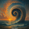 Eine mächtige Welle erhebt sich in vollendeter Spiralform aus dem ruhigen Ozean und öffnet sich wie ein Tor zum Sternenhimmel. Während der Sonnenuntergang den Horizont in warme Farben taucht, windet sich die Form majestätisch in den Kosmos hinein. Dieses surrealistische Kunstwerk verbindet die Urkraft des Wassers mit der Weite des Universums – ein Sinnbild für Übergänge, Zeit und unendliche Bewegung.