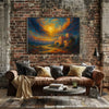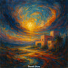 Ein leuchtender Himmel, wirbelnd wie eine Sonne aus lebendiger Farbe, senkt sich über eine Szene aus flacher Wüstenarchitektur. Die Gebäude scheinen aus Ton, angestrahlt vom goldenen Licht, das sich in lebendigen Wellen über den Boden zieht. Die Pinselstruktur ist intensiv und wirkt wie ein bewegtes Gemälde. Dieses Werk pulsiert – es erzählt von Hitze, Stille und Licht.