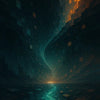 Ein visuelles Portal in eine digitale Dimension: Dieses KI-generierte Kunstwerk zeigt einen leuchtenden Pfad aus Pixelwürfeln, der sich wie ein Fluss durch eine kubische Landschaft schlängelt und in einen strahlenden Horizont mündet. Die Farbwelt aus dunklem Blaugrün und warmem Orange vermittelt Tiefe, Bewegung und die Weite digitaler Räume.