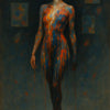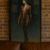 In „Dripping Soul“ steht eine weibliche Figur im Zentrum – vollständig bemalt in vibrierenden Tönen aus Rot, Blau und Orange, als würde die Farbe direkt aus ihrem Inneren fließen. Der Körper scheint zu tropfen, zu verlaufen, als sei er selbst Gemälde und Medium zugleich. Im Hintergrund verschwimmen Rahmen und Farbflächen zu einer melancholischen Szenerie. Dieses Werk spielt mit Identität, Kunst und Vergänglichkeit – kraftvoll, sinnlich und poetisch zugleich.