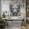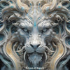 Die zarten Farbverläufe aus Weiß, Elfenbein, Gold und eisigem Blau verleihen der Komposition eine übernatürliche Aura. Der Löwe blickt nicht – er durchdringt, als Verkörperung eines ewigen, unantastbaren Königtums.