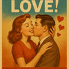 Dieses liebevoll gestaltete Retro-Poster zeigt ein stilisiertes Paar im Look der 1950er-Jahre in einem innigen Moment der Zuneigung. Der Mann im Anzug küsst die Wange der lächelnden Frau mit rotem Haar und rotem Kleid – ein Ausdruck reiner Romantik und Verliebtheit. Im Hintergrund leuchtet ein weicher Farbverlauf von Blau zu Orange, der die warme Atmosphäre unterstützt. Rote Herzsymbole verstärken das Gefühl von Liebe und Hingabe.