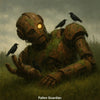 Ein verfallener Roboter liegt überwuchert von Moos inmitten eines dichten Grases. Umgeben von Krähen wirkt das Maschinenwesen gleichzeitig verletzlich und würdevoll – als hätte es einst eine bedeutende Rolle gespielt, nun aber im ewigen Kreislauf der Natur aufgeht. Die Szene erinnert an postapokalyptische Erzählungen, in denen Technologie und Leben ineinander übergehen. Die Komposition spricht von Vergänglichkeit, Erinnerung und dem leisen Dialog zwischen Natur und künstlicher Intelligenz.