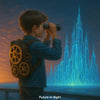 Junge mit mechanischem Zahnrad-Rucksack blickt durch ein Fernglas auf eine digitale Megastadt im Steampunk-Stil bei Sonnenuntergang.