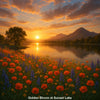 Ein faszinierendes, KI-generiertes Landschaftsbild, das die Magie eines Sonnenuntergangs an einem stillen See zeigt. Im Vordergrund blühen leuchtend orangefarbene Mohnblumen, violette Lupinen und gelbe Wildblumen in voller Pracht. Der See spiegelt das goldene Licht der untergehenden Sonne, während majestätische Berge und ein einzelner Baum die friedliche Szene vervollständigen.