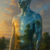 Dieses KI-generierte Kunstwerk zeigt eine stilisierte männliche Figur, deren gesamte Oberfläche eine gemalte Landschaft reflektiert: Himmel, Bäume, Fluss und Licht fließen nahtlos in seinen Körper. Die Figur wirkt wie aus poliertem Stein oder Glas, vollständig durchdrungen von der natürlichen Welt. Das Bild symbolisiert die Verbindung von Mensch und Natur, das Verschmelzen von Identität und Umgebung sowie die innere Landschaft des Bewusstseins. Ideal für Fans von KI Kunst, AI generated art, Konzeptkunst, surrealem Realismus, Midjourney Style und philosophischer digitaler Kunst.