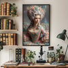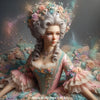 Marie Antoinette – AI Art zeigt die französische Königin in einem prachtvollen Rokoko-Kleid, verziert mit zarten Blumenstickereien und kostbaren Spitzen. Ihr kunstvoll aufgetürmtes, weiß gepudertes Haar ist mit farbenfrohen Blüten und Perlen geschmückt. Schwebende Farbpartikel umgeben die Szene und verstärken die Anmut und Opulenz dieser historischen Darstellung. Eine perfekte Verschmelzung aus historischer Eleganz und moderner digitaler Kunst.