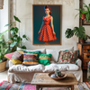 Miss Polka zeigt eine stilvolle junge Frau in einem roten 50er-Jahre-Kleid mit weißen Punkten. Die Hochsteckfrisur, der intensive Blick und das farblich abgestimmte Styling schaffen eine perfekte Mischung aus Eleganz, Nostalgie und Popkultur. Das Kleid mit seinem ausgestellten Rock unterstreicht die feminine Silhouette und erinnert an klassische Modeikonen. Ein ausdrucksstarkes Werk für Liebhaber:innen von Retro und stilvoller Inszenierung.