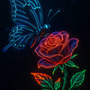 Ein leuchtendes digitales Kunstwerk, das Natur und Technologie auf spektakuläre Weise vereint. Ein cybernetischer Schmetterling aus Licht landet auf einer ebenso digitalen Rose – beide bestehen aus fein leuchtenden Linien in intensiven Neonfarben. Die klare Komposition auf dunklem Hintergrund lässt jedes Detail strahlen und macht das Werk zu einem echten Eyecatcher für moderne Räume oder digitale Sammlungen.