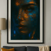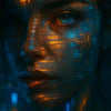 Ein hyperrealistisches, KI-generiertes Porträt einer Frau, deren Gesicht von orange-blauen Lichtstrukturen und digitalen Schaltkreisen überzogen ist. Der Blick ist intensiv, fast durchdringend – als ob sie selbst ein lebendes neuronales Netzwerk wäre. Dieses Kunstwerk verkörpert das Zusammenspiel von Mensch, Maschine und Bewusstsein auf eindrucksvolle Weise.