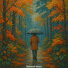 Ein einsamer Mensch mit Regenschirm schreitet durch einen stillen, regennassen Waldweg im Herbst. Die bunten Blätter in warmem Orange, Rot und Gold bilden einen intensiven Kontrast zum kühlen, blauen Regen. Dieses Werk erzählt in stillen Farben von Rückzug, Selbstreflexion und der Schönheit des Alleinseins. Die Komposition wirkt filmisch, fast wie eine Momentaufnahme aus einem träumerischen Indie-Film.