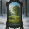 In einer verschneiten Winterlandschaft steht ein antiker Spiegel, der keinen Spiegel zeigt, sondern ein lebendiges Frühlingsfeld: grüne Wiesen, blühende Blumen, ein mächtiger Baum unter strahlendem Himmel. Dieses KI-Kunstwerk spielt mit dem Kontrast der Jahreszeiten und symbolisiert Hoffnung, Übergang und den Zugang zu innerer Lebenskraft. Der Spiegel wird hier zum Portal zwischen Welten – eine Einladung zur Transformation, zur Rückverbindung mit Natur und Licht.