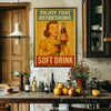 Das Retro-Werbeplakat zeigt eine lächelnde Frau in gelber Bluse, die genüsslich durch einen Strohhalm einen Softdrink aus einem Glas trinkt. In ihrer anderen Hand hält sie eine klassische Glasflasche mit dem Aufdruck „SOFT DRINK“. Die Frau hat geschlossene Augen und wirkt sichtlich erfrischt. Der Hintergrund ist in warmen Beige- und Brauntönen gehalten. Oben im Bild steht in großen Lettern der Werbeslogan „ENJOY THAT REFRESHING“ – wobei das Wort „REFRESHING“ betont und kursiv gesetzt ist. Unten befindet sich ein kräftiger roter Balken mit dem Schriftzug „SOFT DRINK“ in großen weißen Buchstaben. Die Szene strahlt pure Nostalgie und Erfrischung aus – ganz im Stil amerikanischer 1950er-Jahre-Werbung.