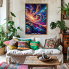 Stellar Swirl – AI Art zeigt ein leuchtendes, galaktisches Wirbelmuster aus kräftigen Blau-, Violett- und Goldtönen. Die dynamische Komposition erinnert an kosmische Nebel und Sternenexplosionen. Dieses digitale Kunstwerk verbindet intensive Farben mit fließenden Formen und erzeugt eine hypnotische, fast unendliche Raumwirkung – ein Blick in ein funkelndes Universum.