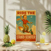Dieses Retro-Werbeplakat zeigt einen begeisterten Jungen, der auf einem futuristischen Tretroller – dem „Strato-Scooter“ – durch die Lüfte fliegt. Der Junge trägt ein rotes Poloshirt und beige Hosen, seine Faust ist jubelnd in die Höhe gereckt. Aus dem Heck des Rollers schießt eine feurige Raketenflamme, die für Antrieb sorgt. Der Hintergrund zeigt einen blauen Himmel mit Sternschnuppe und weißen Wolken – die Szene vermittelt Geschwindigkeit, Spaß und Abenteuerlust. Oben im Bild steht in großen roten Lettern: „RIDE THE“, darunter auf einem gelben Banner „NEW“. Unten prangt in Weiß auf rotem Grund der Produktname „STRATO-SCOOTER“. Das Motiv ist eine nostalgische Hommage an technische Fantasie und kindliche Begeisterung.
