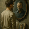 Dieses KI-generierte Kunstwerk zeigt eine kraftvolle Szene innerer Reflexion: Ein junger Mann blickt in einen antiken Spiegel, in dem nicht sein eigenes Gesicht erscheint, sondern das eines alten Mannes – ernst, nachdenklich, gezeichnet vom Leben. Auf dem Tisch davor liegt ein aufgeschlagenes Buch mit dem Bild einer Frau. Das Werk thematisiert Identität, Erinnerung, Zeitreise und Selbstwahrnehmung. Perfekt für Liebhaber von KI Kunst, AI generated art, psychologischer Konzeptkunst, digitalem Realismus und Midjourney Style.
