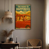 Das Retro-Plakat zeigt eine fröhliche Familie in einem roten Auto auf dem Weg in den Urlaub. Vater, Mutter und Sohn sitzen gut gelaunt im Wagen, der durch eine idyllische Berglandschaft mit Nadelwäldern und blauem Himmel fährt. Auf dem Dach ist ein brauner Koffer festgeschnallt, was auf eine Reise hinweist. Alle Personen sind im Stil der 1950er Jahre gekleidet, lächeln glücklich und schauen erwartungsvoll nach vorn. Über dem Bild steht in großen, hellen Buchstaben der optimistische Slogan: „THE ROAD TO HAPPINESS“. Die Szene symbolisiert klassische Familienwerte, Abenteuerlust und die Freude an gemeinsamen Reisen – ein nostalgischer Rückblick auf sorglose Zeiten.