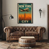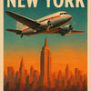 Dieses eindrucksvolle Retro-Poster im Stil der 1940er–50er Jahre zeigt ein Passagierflugzeug im Landeanflug über die Skyline von Manhattan. Im Zentrum steht das Empire State Building, umrahmt vom orangefarbenen Sonnenuntergang und umgeben von klassischen Wolkenkratzern. Die Szene strahlt Abenteuerlust, Reisefieber und den Glanz vergangener Zeiten aus – ideal für Liebhaber von Vintage-Reklame, Reisethemen und ikonischer Architektur. Perfekt als Wandkunst für Wohnzimmer, Büro oder Reiseagentur.