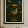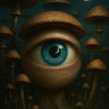 Ein surreales Kunstwerk mit einem gigantischen, blauen Auge, das aus dem Stamm eines Pilzes wächst. Umgeben von übergroßen Pilzen und einem nächtlichen Himmel mit Sichelmond, vermittelt die Szene ein mystisches und psychedelisches Gefühl – als würde der Wald selbst beobachten.