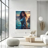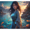 Dieses detailreiche digitale Kunstwerk, erstellt mit künstlicher Intelligenz (AI generated art), zeigt eine junge Frau in einem fließenden blauen Kimono vor einer atemberaubenden Küstenlandschaft bei Sonnenuntergang. Um sie herum schweben leuchtende orangefarbene Fische im türkisblauen Wasser, während im Hintergrund majestätische Berge in warmes Licht getaucht sind. Die Komposition vereint Elemente von Fantasy Artwork, surrealer Magie und träumerischer Ruhe. Ideal für Sammler von KI Kunst, digitale Kunstliebhaber und Fans von Midjourney Style. Diese Szene verkörpert die Faszination von AI Artworks – zwischen Realität und Fantasie.