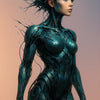 Wired Beauty zeigt eine weibliche Android-Figur in einem technoid-ästhetischen Stil. Ihr Körper wirkt wie aus blauen Metallplatten zusammengesetzt, durchzogen von feinen Energieadern. Der Kopf öffnet sich in filigranen, fragmentierten Strukturen, was Bewegung und Transformation andeutet. Die Figur steht selbstbewusst vor einem sanften Farbverlauf im Hintergrund – kühl, kraftvoll und stilisiert. Dieses Werk verbindet feminine Eleganz mit futuristischer Technologie auf eindrucksvolle Weise.