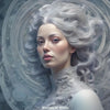 Sie erscheint wie eine Vision aus Licht und Äther – eine Frau, gehüllt in reines Weiß, umgeben von einem Hauch des Mystischen. Ihr Blick ist ruhig und zugleich durchdringend, als würde sie durch Zeit und Raum hindurchsehen. Ihr Haar, weich und in fließenden Wellen, umrahmt ihr Gesicht wie ein leuchtender Heiligenschein.